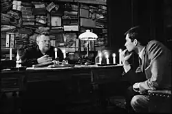 Although The Trial has often been compared to Psycho, Perkins did not express concern about potential typecasting, particularly given the opportunity to work with Welles. He described Welles as confident in his abilities but not authoritarian, saying, "He's wonderfully sure of himself and his ability without being dictatorial and autocratic about it ... [H]e isn't inflexible".[96] During production, which exceeded its budget, Perkins maintained a high regard for Welles and even considered writing a book about the director. He carried a tape recorder in his coat for weeks but ultimately abandoned the project out of concern that it might offend Welles. Welles later expressed disappointment that Perkins did not follow through, stating, "Oh, why didn't you [do it]? Why didn't you? I would have loved it!"[97]