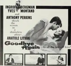 After buying out his contract with Paramount, Perkins relocated to France and began working in European cinema. His first film in this period was Goodbye Again (1961), co-starring Ingrid Bergman and filmed in Paris. The film was originally titled Time on Her Hands, but the English-language title Goodbye Again was suggested by Perkins, referencing one of his father's plays.[91] During production, Bergman reportedly expressed romantic interest in Perkins, which he declined.[6] Perkins's performance in the film received critical acclaim and earned him the Cannes Film Festival Award for Best Actor.[91]