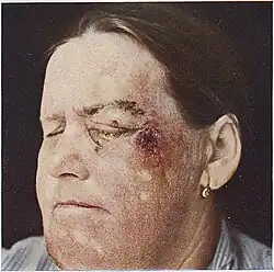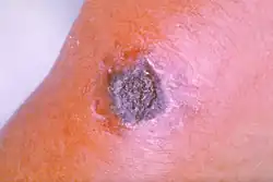 Cutaneous anthrax, also known as hide-porter's disease, is when anthrax occurs on the skin. It is the most common (>90% of cases) and least dangerous form (low mortality with treatment, 23.7% mortality without).[21][5] Cutaneous anthrax presents as a boil-like skin lesion that eventually forms an ulcer with a black center (eschar). The black eschar often shows up as a large, painless, necrotic ulcer (beginning as an irritating and itchy skin lesion or blister that is dark and usually concentrated as a black dot, (somewhat resembling bread mold) at the site of infection. In general, cutaneous infections form within the site of spore penetration two to five days after exposure. Unlike bruises or most other lesions, cutaneous anthrax infections normally do not cause pain. Nearby lymph nodes may become infected, reddened, swollen, and painful. A scab forms over the lesion soon, and falls off in a few weeks. Complete recovery may take longer.[22] Cutaneous anthrax is typically caused when B. anthracis spores enter through cuts on the skin. This form is found most commonly when humans handle infected animals and/or animal products.[23]