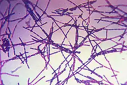 Bacillus anthracis is a rod-shaped, Gram-positive, facultative anaerobe[32] bacterium about 1 by 9 μm in size.[2] It was shown to cause disease by Robert Koch in 1876 when he took a blood sample from an infected cow, isolated the bacteria, and put them into a mouse.[33] The bacterium normally rests in spore form in the soil, and can survive for decades in this state. Herbivores are often infected while grazing, especially when eating rough, irritant, or spiky vegetation; the vegetation has been hypothesized to cause wounds within the gastrointestinal tract, permitting entry of the bacterial spores into the tissues. Once ingested or placed in an open wound, the bacteria begin multiplying inside the animal or human and typically kill the host within a few days or weeks. The spores germinate at the site of entry into the tissues and then spread by the circulation to the lymphatics, where the bacteria multiply.[34]