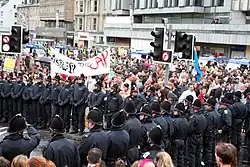 On September 11, 2000, a meeting of the World Economic Forum in Melbourne, Australia was disrupted for three days by up to 20,000 protesters.[54] The WEF's Asia Pacific Economic Conference was opposed by a range of groups organising under the umbrella of the S11 alliance, which included anarchist, socialist, environmentalist and other social justice groups.[55] Approximately twenty protesters were arrested and claims were made that 400 were injured by police, including fifty who needed to attend hospital.[56]