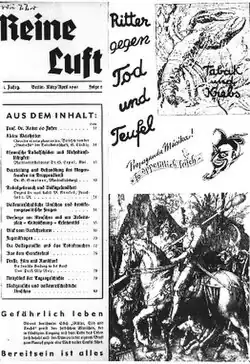 Well-known health magazines like the Gesundes Volk (Healthy People),[34] Volksgesundheit (People's Health) and Gesundes Leben (Healthy Life)[55] also published warnings about the health consequences of smoking[34][55] and posters showing the harmful effects of tobacco were displayed.[34] Some anti-smoking posters were unapproved and censured by the government.[9] Editorials discussing the issue of smoking and its effects were published in newspapers.[56] Articles advocating nonsmoking were also published in the magazines Die Genussgifte (The Recreational Stimulants), Auf der Wacht (On the Guard) and Reine Luft (Clean Air).[57] Out of these magazines, Reine Luft was the main journal of the anti-tobacco movement.[1][8] Karl Astel's Institute for Tobacco Hazards Research at Jena University purchased and distributed hundreds of reprints from Reine Luft.[8] The magazine was published by tobacco control activists; it was later, in 1941, ordered by the propaganda ministry to moderate its tone and submit all material for pre-approval.[9]