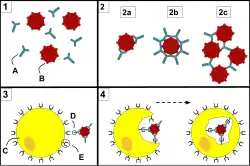 - Agglutination, in which antibodies "glue together" foreign cells into clumps that are attractive targets for phagocytosis