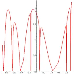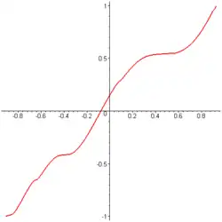 since for any partition of , one can choose sample points for the Riemann sum from the set , giving a value of 0 for the sum. It follows that g has a set of discontinuities of positive Lebesgue measure. Figure 1 on the right shows an approximation to the graph of g(x) where and the series is truncated to 8 terms. Figure 2 shows the graph of an approximation to the antiderivative G(x), also truncated to 8 terms. On the other hand if the Riemann integral is replaced by the Lebesgue integral, then Fatou's lemma or the dominated convergence theorem shows that g does satisfy the fundamental theorem of calculus in that context. - In Examples 3 and 4, the sets of discontinuities of the functions g are dense only in a finite open interval However, these examples can be easily modified so as to have sets of discontinuities which are dense on the entire real line . Let Then has a dense set of discontinuities on and has antiderivative
