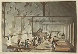 Sugar cane was one of the most gruelling and dangerous crops slaves were forced to cultivate. Harvesting cane required backbreaking long days in sugar cane fields under the hot island sun. Sugar cane spoiled quickly after harvest, and the milling process was slow and inefficient, forcing the mill and boiling house to operate 24 hours a day during harvest season.[23] Sugar mills and boiling houses were two of the most dangerous places for slaves to work on sugar plantations. In mills wooden or metal rollers were used to crush cane plants and extract the juices. Slaves were at risk of getting their limbs stuck and ripped off in the machines.[23] Similarly, in sugar boiling houses slaves worked under extremely high temperatures and at the risk of being burned in the boiling sugar mixture or getting their limbs stuck.[23]