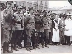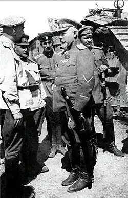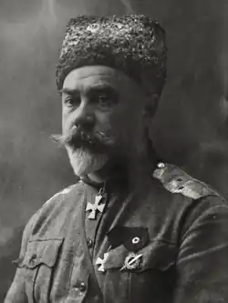 In April 1915, the brigade was expanded into the 4th Rifle "Iron" Division.[21] During the Great Retreat of 1915, the division fought a series of costly defensive battles amid severe shortages of ammunition. In September 1915, during the fighting near Łuck, Denikin's division launched a surprise counter-attack, capturing the city and taking nearly 10,000 prisoners. For this, Denikin was promoted to lieutenant general.[22] In October, he captured Czartoryjsk in another daring action that involved flanking the enemy lines with military bands playing.[23] He was awarded the Sword of St. George studded with diamonds for his role in the Łuck breakthrough of May 1916.[24]