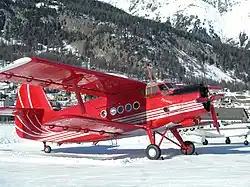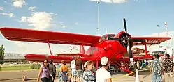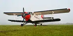 The Antonov An-2 (USAF/DoD reporting name Type 22,[3] NATO reporting name Colt[4]) is a Soviet mass-produced single-engine biplane utility/agricultural aircraft designed and manufactured by the Antonov Design Bureau beginning in 1947.[1] Its durability, lifting power, and ability to take off and land from poor runways have given it a long service life. The An-2 was produced up to 2001 and remains in service with military and civilian operators around the world.