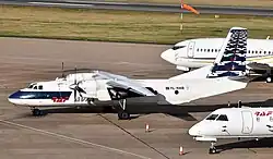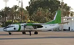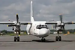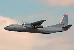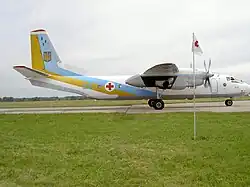 The Antonov An-26 (NATO reporting name: Curl) is a twin-engined turboprop civilian and military transport aircraft, designed and produced in the Soviet Union from 1969 to 1986.[3] It is the third member of the Antonov An-24 family, coming after the An-24 and An-30, while preceding the An-32 and cancelled An-132. The An-26 was eventually license-produced in China as the Xi'an Y-7, which eventually evolved into the Xi'an MA60 airliner.