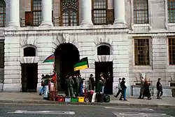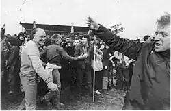 Whites reacted negatively to the changes, allowing the Herenigde Nasionale Party (or simply the National Party) to convince a large segment of the voting bloc that the impotence of the United Party in curtailing the evolving position of nonwhites indicated that the organisation had fallen under the influence of Western liberals.[53] Many Afrikaners resented what they perceived as disempowerment by an underpaid black workforce and the superior economic power and prosperity of white English speakers.[55] Smuts, as a strong advocate of the United Nations, lost domestic support when South Africa was criticised for its colour bar and the continued mandate of South West Africa by other UN member states.[56]