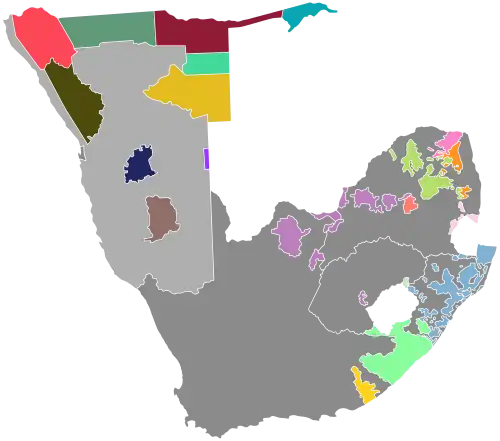 Under the homeland system, the government attempted to divide South Africa and South West Africa into a number of separate states, each of which was supposed to develop into a separate nation-state for a different ethnic group.[95]