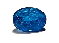 Apatite is infrequently used as a gemstone. Transparent stones of clean color have been faceted, and chatoyant specimens have been cabochon-cut.[3] Chatoyant stones are known as cat's-eye apatite,[3] transparent green stones are known as asparagus stone,[3] and blue stones have been called moroxite.[35] If crystals of rutile have grown in the crystal of apatite, in the right light the cut stone displays a cat's-eye effect. Major sources for gem apatite are[3] Brazil, Myanmar, and Mexico. Other sources include[3] Canada, Czech Republic, Germany, India, Madagascar, Mozambique, Norway, South Africa, Spain, Sri Lanka, and the United States.