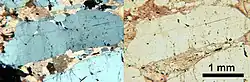 Apatite in photomicrographs of a thin section from the Siilinjärvi apatite mine. In cross-polarized light on left, plane-polarized light on right.