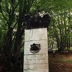 Source of the Tiber river at Mount Fumaiolo, marked by a column with an eagle and wolves, part of the Apennine fauna and symbols of Rome. The inscription reads: "Here the river sacred to the destinies of Rome is born."