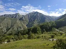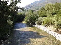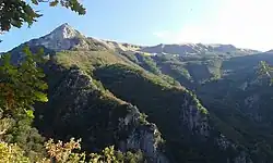 The valley of the Ofanto, which runs into the Adriatic close to Barletta, marks the northern termination of the first range of the Lucanian Apennines (now Basilicata), which runs from east to west, while south of the valleys of the Sele (on the west) and Basento (on the east)—which form the line followed by the railway from Battipaglia via Potenza to Metaponto—the second range begins to run due north and south as far as the plain of Sibari. The highest point is the Monte Pollino 2,233 metres (7,325 ft). The chief rivers are the Sele—joined by the Negro and Calore—on the west, and the Bradano, Basento, Agri, Sinni on the east, which flow into the gulf of Taranto; to the south of the last-named river there are only unimportant streams flowing into the sea east and west, inasmuch as here the width of the peninsula diminishes to some 64 kilometres (40 mi).[22] The Cilento mountain range is the western part of the Lucan Appennines, as the Alburni and Eremita-Marzano mounts, part of the province of Salerno; Mount Cervati (1899 m) is the highest of this area.[23][24]