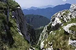The mountains lend their name to the Apennine peninsula that forms the major part of Italy.[7] They are mostly verdant, although one side of the highest peak, Corno Grande, is partially covered by Calderone glacier, the only glacier in the Apennines.[8] The eastern slopes down to the Adriatic Sea are steep, whilst the western slopes form foothills on which most of the towns of peninsular Italy are located. The mountains tend to be named after the province or provinces in which they are located; for example the Ligurian Apennines are in Liguria.