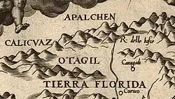 After the 1540 expedition of Hernando de Soto, Spanish cartographers began to apply the name of the tribe to the mountains themselves. The first cartographic appearance of Apalchen is on Diego Gutiérrez's map of 1562; the first use for the mountain range is the map of Jacques le Moyne de Morgues in 1565.[10]