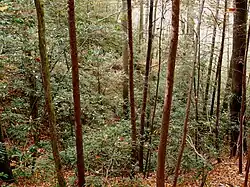 The oak forests generally lack the diverse small tree, shrub and herb layers of mesic forests. Shrubs are generally ericaceous, and include the evergreen mountain laurel (Kalmia latifolia), various species of blueberries (Vaccinium spp.), black huckleberry (Gaylussacia baccata), a number of deciduous rhododendrons (azaleas), and smaller heaths such as teaberry (Gaultheria procumbens) and trailing arbutus (Epigaea repens ). The evergreen great rhododendron (Rhododendron maximum) is characteristic of moist stream valleys. These occurrences are in line with the prevailing acidic character of most oak forest soils. In contrast, the much rarer chinquapin oak (Quercus muehlenbergii) demands alkaline soils and generally grows where limestone rock is near the surface. Hence no ericaceous shrubs are associated with it.