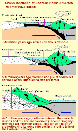 The Taconic Orogeny was the second of four mountain building plate collisions that contributed to the formation of the Appalachians, culminating in the collision of North America and Africa (see Alleghanian orogeny).[26]