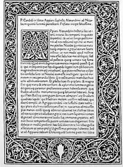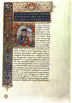 ![]() A page of the Latin translation of Appian’s "Roman History" by Pier Candido Decembrio, with imaginary portrait of the historian | |