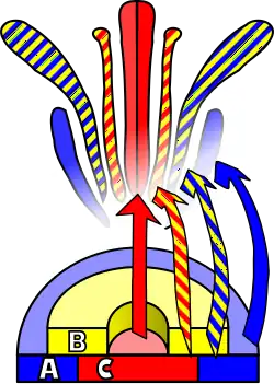 Observations of homeotic mutations led to the formulation of the ABC model of flower development by E. Coen and E. Meyerowitz.[64] According to this model, floral organ identity genes are divided into three classes - class A genes (which affect sepals and petals), class B genes (which affect petals and stamens), and class C genes (which affect stamens and carpels). These genes code for transcription factors that combine to cause tissue specification in their respective regions during development. Although developed through study of A. thaliana flowers, this model is generally applicable to other flowering plants.
