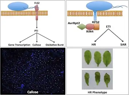 A schematic of PAMP-triggered immunity: recognition of flagellin by FLS2 (top left); effector-triggered immunity depicted through the recognition of avrRpt2 by RPS2 through RIN4 (top-right); microscopic view of callose deposition in an A. thaliana leaf (bottom left); an example of no hypersensitive response (HR) above, and HR in A. thaliana leaves below (bottom right)