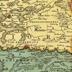 Arad was first mentioned in documents in the 11th century. According to the Chronicon Pictum, at "an assembly of the realm near Arad"[12] in early to mid-1131, Queen Helena ordered the slaughter of all noblemen who were accused of having suggested the blinding of her husband to King Coloman.[13][14] King Béla II of Hungary distributed the goods of the executed magnates between the newly established Arad Chapter and the early 11th-century Óbuda Chapter.[15] The Mongol invasion of the Kingdom of Hungary in 1241 showed the importance of the fortifications in this place, to which were added in the second half of the 13th century more stone fortresses at Șoimoș, Șiria, and Dezna. The Ottoman Empire conquered the region from Hungary in 1551 and kept it until the Peace of Karlowitz of 1699, although during this period it was temporarily reintegrated in the Principality of Transylvania, after the Transylvanian troops cleared the lower valley of the Mureș in 1595; and after the victory of Mihai Viteazu's troops at Șelimbăr, the city entered under the Voivode's authority.[16] During the Ottoman period, Arad became an eyalet center, which comprised the sanjaks of Arad, Lugoj, Kacaș, Beşlek and Yanova from 1660 till 1697, when it was captured by Austrians (Serbian Militia under command of Subota Jović) during Ottoman-Habsburg wars (1683–1699). After 1699, the city was ruled by the Habsburg monarchy. At the beginning of the 18th century, Arad became the center of the Eastern Orthodox Eparchy of Arad. According to 1720 data, the population of the city was composed of 177 Romanian families, 162 Serbian, and 35 Hungarian.[17]
