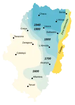 ![]() Map of Aragon with the dialects of northern Aragon in grey, blue, and light orange | |