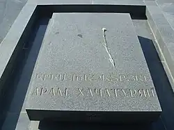 In early October 1965, Khachaturian was briefly admitted into a hospital in Geneva after a heart attack.[126][127] He died in Moscow on 1 May 1978, after a long illness,[8][52] just short of his 75th birthday.[46] He was buried at the Komitas Pantheon[128] in Yerevan on 6 May, next to other distinguished Armenians.[11]