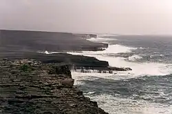 Huge boulders up to 50 m (160 ft) above the sea at parts of the west-facing cliffs are an extreme form of storm beach, cast there by waves.[21] Previously considered as possible tsunami deposits, these coastal boulder deposits have recently been shown (by Rónadh Cox and collaborators) to be definitively the work of storms.[22]
