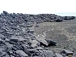 Little is known about the first inhabitants to cross over to the islands, but they likely came across in search of a safe haven from attack.[3] The islands are made up of Carboniferous limestone and do not have naturally occurring topsoil.[4] Early settlers augmented the soil with seaweed and sand from the shore.[5][6] Drystone walls were built to protect the soil.[7] Seven prehistoric stone forts are on the islands. Dún Aonghasa, on Inishmore, dates back to 1100 BC.[8]