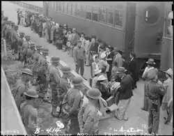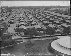 The Santa Anita Assembly Center site is California Historical Landmark #934. In 1942 during World War II, the racetrack grounds were used as a processing and holding site for Japanese Americans who had been removed from their homes and communities for forced relocation and internment under President Franklin Roosevelt's Executive Order 9066. The Civilian Assembly Center at the racetrack became the largest and longest operating one of the eighteen, holding citizens until the Relocation Center camps were completed in interior areas of California and other states.[16] More than 18,000 persons resided at the racetrack in primitive conditions.[16][17] Four hundred temporary tarpaper barracks were constructed on the racetrack grounds to house many of the detainees, where they lived three families per unit. 8,500 detainees lived in converted horse stalls.[16] Bachelors were housed in the grandstand building.[16] They had group showers, non-private bathrooms, and 24-hour armed surveillance. Each resident was given an "Army manufacture bed, one blanket and one straw tick."[18] The Assembly Center held people from late March through the end of October 1942, when the internees were relocated inland to permanent internment camps at Manzanar and Tule Lake in California, and eight others in Western states and Arkansas.
