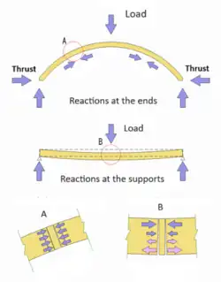 A true arch, due to its rise, resolves the vertical loads into horizontal and vertical reactions at the ends, a so called arch action. The vertical load produces a positive bending moment in the arch, while the inward-directed horizontal reaction from the spandrel/abutment provides a counterbalancing negative moment. As a result, the bending moment in any segment of the arch is much smaller than in a beam with the equivalent load and span.[23] The diagram on the right shows the difference between a loaded arch and a beam. Elements of the arch are mostly subject to compression (A), while in the beam a bending moment is present, with compression at the top and tension at the bottom (B).