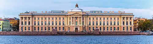 Naryshkin Baroque, also known as Muscovite Baroque or Moscow Baroque, emerged in Moscow towards the end of the 17th century. The first of these structures were built on the Boyarin Naryshkin estate, hence the name Naryshkin Baroque.[57] A characteristic of the Naryshkin Baroque is the combination of influences from western Europe with traditional Russian forms, and is mainly present in ecclesiastical architecture with a few secular examples. Naryshkin Baroque shows an evolution from previous, seemingly "Baroque" examples, which might seem Baroque in decoration, but still maintained the traditional structural form.[58] There are several components characteristic to these newer structures, such as a focus on a balance of symmetry, carved limestone cornices, attached columns, and a more classical style.[59]