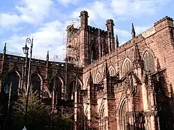Built between 1093 and 1537, Chester Cathedral includes a set of medieval choir stalls dating from 1380, with exquisite figurative carving. An unusual feature is the very large south transept. The Early English Lady Chapel is a harmonious composition in Lancet Gothic. It retains substantial monastic buildings including a large refectory.[4][23]