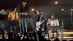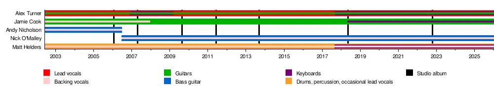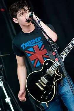 ![]() Arctic Monkeys performing at the Roskilde Festival in 2014. From left to right: Nick O'Malley, Alex Turner, Matt Helders and Jamie Cook | |
