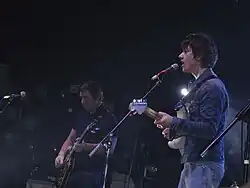 Arctic Monkeys headlined the Glastonbury Festival on 22 June 2007, the highlights of which were aired on BBC2.[13] During their headline act, the band performed with Dizzee Rascal and Simian Mobile Disco and covered Shirley Bassey's "Diamonds Are Forever".[78] The band also played a large gig at Dublin's Malahide Castle on 16 June 2007, with a second date added the following day.[79] On 28–29 July 2007 the band played their biggest concert to date with two sell out shows at the 55,000 capacity Old Trafford Cricket Ground in Manchester.[80][81] Billed as being the group's own 'mini-festivals' both date saw support sets for Supergrass, The Coral, Amy Winehouse and Japanese Beatles tribute act The Parrots.[80][81] The shows were hailed as 'the gigs of a generation' by NME and were even compared to Oasis' record-breaking shows at Knebworth House in 1996.[81] The LCCG concerts cemented Arctic Monkeys' status as the defining band of their generation, as Oasis had done before them.[81] The band was also slated to play the Austin City Limits Music Festival in September 2007.[82] Other European festivals include Rock Werchter in 2007.[83] The band played two shows at Cardiff International Arena on 19 and 20 June 2007.[84] They also played two London gigs at Alexandra Palace on 8 and 9 December 2007.[85] On 1 September 2007 the band performed an intimate show at Ibiza Rocks show in Bar M (now Ibiza Rocks Bar) along with Reverend and the Makers.[86] The band played their last show of the tour on 17 December 2007 at Manchester Apollo, which was filmed for the live album and video release At the Apollo, which was released in cinemas the following year.[87][88][89]