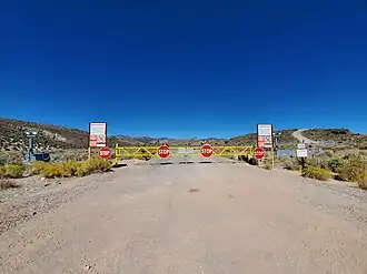 The original rectangular base of 6 by 10 miles (10 by 16 km) is part of the "Groom box", a rectangle of restricted airspace measuring 23 by 25 miles (37 by 40 km). The area is connected to the internal Nevada Test Site (NTS) road network, with paved roads leading south to Mercury and west to the NTS's Yucca Flat region. Leading northeast from the lake, the wide and well-maintained Groom Lake Road runs through a pass in the Jumbled Hills. The road formerly led to mines in the Groom basin; it has been improved since their closure. It winds past a security checkpoint; the restricted area around the base extends farther east. After leaving the restricted area, Groom Lake Road descends eastward to the floor of the Tikaboo Valley, passing the dirt-road entrances to several small ranches before converging with State Route 375, the "Extraterrestrial Highway", south of Rachel.[10]
