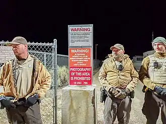 The perimeter of the base is marked out by orange posts and patrolled by guards in white pickup trucks and camouflage fatigues. The guards are popularly referred to as "camo dudes" by enthusiasts.[67][68] The guards will not answer questions about their employers; however, according to the New York Daily News, there are indications they are employed through a contractor such as AECOM.[68][69] Signage around the base perimeter advises that deadly force is authorized against trespassers.[70]