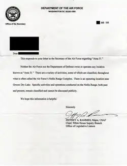 All research and occurrences in Area 51 are Top Secret/Sensitive Compartmented Information (TS/SCI).[6] The CIA publicly acknowledged the base's existence on 25 June 2013, through a Freedom of Information Act (FOIA) request filed in 2005; it has declassified documents detailing its history and purpose.[7] The intense secrecy surrounding the base has made it the frequent subject of conspiracy theories and a central component of unidentified flying object (UFO) folklore.[8][9]