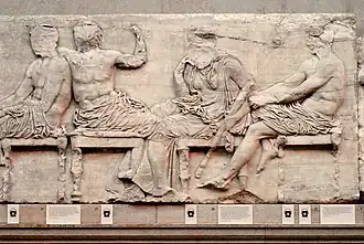 In Homer's Iliad, Ares has no fixed allegiance. He promises Athena and Hera that he will fight for the Achaeans but Aphrodite persuades him to side with the Trojans. During the war, Diomedes fights Hector and sees Ares fighting on the Trojans' side. Diomedes calls for his soldiers to withdraw.[72] Zeus grants Athena permission to drive Ares from the battlefield. Encouraged by Hera and Athena, Diomedes thrusts with his spear at Ares. Athena drives the spear home, and all sides tremble at Ares's cries. Ares flees to Mount Olympus, forcing the Trojans to fall back.[73] Ares overhears that his son Ascalaphus has been killed and wants to change sides again, rejoining the Achaeans for vengeance, disregarding Zeus's order that no Olympian should join the battle. Athena stops him. Later, when Zeus allows the gods to fight in the war again, Ares attacks Athena to avenge his previous injury. Athena overpowers him by striking him with a boulder.[74]