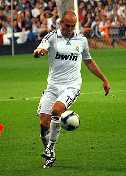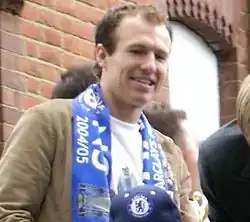 Robben first came to prominence with Groningen, for whom he was player of the year for the 2000–01 Eredivisie season. Two years later he signed for PSV, where he became the Netherlands' Young Player of the Year and won an Eredivisie title.[7] The following season Robben's signature was pursued by leading clubs, and after protracted transfer negotiations, he joined Chelsea in 2004. Robben's Chelsea debut was delayed through injury, but upon returning to fitness, he helped Chelsea bring home two consecutive Premier League titles, and was the Premier League Player of the Month in November 2004.[8][9] After a third season in England which was punctuated by injury, Robben signed for Real Madrid in a transfer worth €35 million.