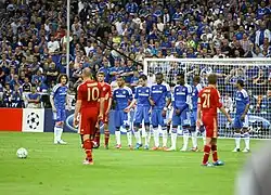 In August 2009, Robben transferred to Bayern Munich for a fee of around €25 million.[10] In his first season in Munich, Bayern won the league title, Robben's fifth league title in eight years. Robben scored the winning goal in the 2013 Champions League final, being named to the Squad of the Season. In 2014, he was named to the FIFPro World XI and the UEFA Team of the Year, and fourth place in the Ballon d'Or.[11] In Germany, he won 20 trophies, including eight Bundesliga titles and five DFB Pokals. During his long tenure at Bayern, Robben was also known for his fruitful partnership with fellow winger Franck Ribéry – together they were affectionately referred to by the nickname Robbery.[12][13]