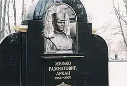 A memorial ceremony in Ražnatović's honour was held on 19 January 2000, with writer Branislav Crnčević, Yugoslav Left official Aleksandar Vulin, singers Oliver Mandić, Toni Montano, and Zoran Kalezić, along with the entire first team of FK Obilić, including club director Dragoslav Šekularac, in attendance.[69] Ražnatović was buried at the Belgrade New Cemetery with military honours by his volunteers[70] and with funeral rites on 20 January 2000. Sources dispute the number of people that attended, but most sources state between 2,000[71] to 10,000 people attended the funeral.[72][73]