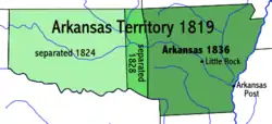 Additional Native American removals began in earnest during the territorial period, with final Quapaw removal complete by 1833 as they were pushed into Indian Territory.[36] The capital was relocated from Arkansas Post to Little Rock in 1821, during the territorial period.[37]