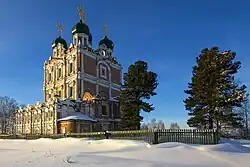 The most notable wooden churches are triple church ensembles, which consist of two churches (a bigger, not heated, church used in the summer, and a smaller, heated church used in the winter) and a bell-tower. Not more than a dozen of these triple wooden ensembles survived, the best known being the one located in the Kizhi Pogost in the Republic of Karelia and is classified as World Heritage. Most of these ensembles are located in the Arkhangelsk Oblast, in particular, in the villages of Varzogory and Abramovskaya (Onezhsky District). Other notable wooden churches are located in Kargopolsky (Oshevenskoye, Krasnaya Lyaga, Saunino and others), Verkhnetoyemsky (Soyezerskaya Pustyn), Onezhsky, Primorsky, and Plesetsky (Porzhensky Pogost) districts. Despite being listed as cultural heritage, most of these buildings are neglected and regularly burn down. As a matter of fact, the majority of the churches considered as masterpieces has been lost.[39] For instance, Verkhnemudyugsky Pogost in Onezhsky District, a triple church ensemble, burned down in 1997.[40] A church and the bell-tower of the triple ensemble in Lyadiny (Kargopolsky District) burned down on 6 May 2013.[41]