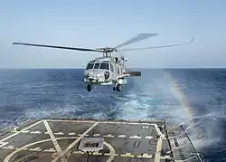 Flights IIA and III have two hangars for stowing MH-60 helicopters. Their Light Airborne Multi-Purpose System (LAMPS) helicopter system improves the ship's capabilities by enabling the MH-60 to monitor submarines and surface ships, launch torpedoes and missiles against them, and provide fire support during insertions/extractions with machine guns and Hellfire anti-armor guided missiles. The helicopters also serve in a utility role, able to perform vertical replenishment, search and rescue, medical evacuation, communications relay, and naval gunfire spotting and control.[80]