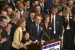 In 2004, Specter faced a challenge in the Republican primary election from conservative Congressman Pat Toomey, whose campaign theme was that Specter was not conservative enough. The match-up was closely watched nationally, being seen as a symbolic clash between the conservative and moderate wings of the Republican Party. However, most of the state and national Republican establishment, including the state's other senator at the time, Rick Santorum, closed ranks behind Specter. Specter was supported by President George W. Bush. Specter narrowly avoided a major upset with 51% of the primary vote. Once Specter defeated the challenge from the right, he was able to enjoy great support from independents and some Democrats in his race against U.S. Representative Joe Hoeffel, the Democratic nominee.[60] Hoeffel trailed Specter in name recognition, campaign funds, and poll results.[61] Although the two minor candidates in the race were seen as more conservative than Specter, they were only able to take 5.39 percent of the vote, and Specter was easily re-elected.