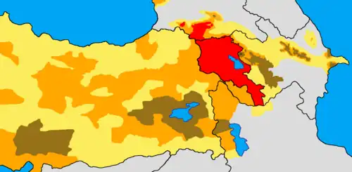 Some scholars have linked the name Armenia with the Early Bronze Age state of Armani (Armanum, Armi) or the Late Bronze Age state of Arme (Shupria).[31] These connections are inconclusive as it is not known what languages were spoken in these kingdoms. Additionally, while it is agreed that Arme was located to the immediate west of Lake Van (probably in the vicinity of Sason, and therefore in the greater Armenia region), the location of the older site of Armani is a matter of debate. Some modern researchers have placed it near modern Samsat,[32] and have suggested it was populated, at least partially, by an early Indo-European-speaking people.[33] It is possible that the name Armenia originates in Armini, Urartian for "inhabitant of Arme" or "Armean country".[34] The Arme tribe of Urartian texts may have been the Urumu, who in the 12th century BC attempted to invade Assyria from the north with their allies the Mushki and the Kaskians. The Urumu apparently settled in the vicinity of Sason, lending their name to the regions of Arme and the nearby lands of Urme and Inner Urumu.[35]