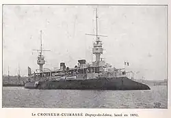 The French navy adopted the protected cruiser wholeheartedly in the 1880s. The Jeune Ecole school of thought, which proposed a navy composed of fast cruisers for commerce raiding and torpedo-boats for coast defense, was particularly influential in France. The first French protected cruiser was Sfax, laid down in 1882, and followed by six classes of protected cruiser – and no armored cruisers until Dupuy de Lôme, laid down in 1888 but not finished until 1895. Dupuy de Lôme was a revolutionary ship, being the first French armored cruiser to dispose entirely of masts, and sheathed in steel armor. However, she and two others were not sufficiently seaworthy, and their armor could be penetrated by modern quick-firing guns. Thus from 1891 to 1897 the French reverted to the construction of protected cruisers.[13]