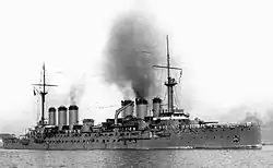 "The supreme embodiment of the armored cruiser," in historian Robert K. Massie's words, was the German ship SMS Blücher.[37] An enlarged version of the Scharnhorst class with a speed of 24.25 knots, armed with 12 8.2-inch (208 mm) and eight 5.9-inch (150 mm) guns, Blücher was planned as an armored cruiser in part because the British had misled the Germans on the Invincibles then being constructed. The Germans expected these new British ships to be armed with six or eight 9.2 in (23 cm) guns.[38] One week after the final decision to construct Blücher, the German naval attache learned they would carry eight 30.5 cm (12.0 in) guns, the same type mounted on battleships. With no funds available to redesign Blücher, work was ordered to proceed as scheduled.[39] Although much more powerful than a typical armored cruiser, she was significantly weaker than the new British battlecruisers.[40] According to the historian Aidan Dodson, Blücher was "...overall a far better balanced design" compared to Invincible, as while Blücher's 21 cm armament was clearly outclassed by the eight 30.5 cm (12 in) guns of the Invincibles in terms of power, the guns had similar maximum effective ranges, and Blücher had better armor protection.[41]